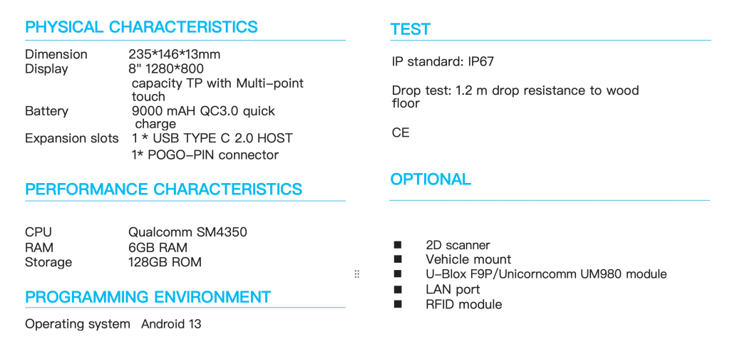 Display | 8 inch IPS screen, 1280*800, 5700 nits |